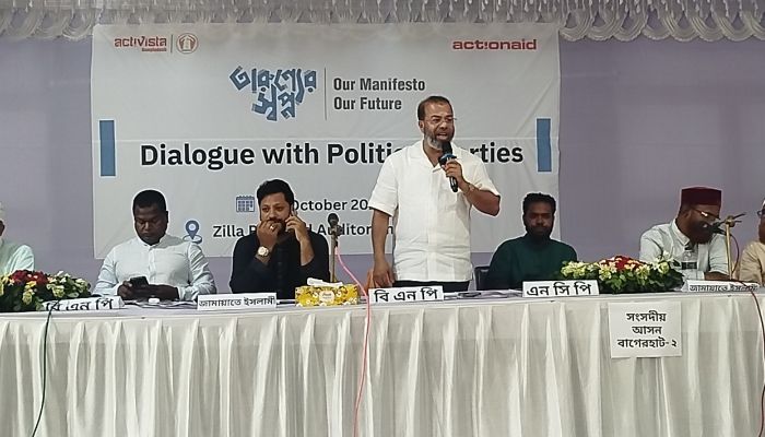 বাগেরহাটে তরুণদের নেতৃত্বে নির্বাচনী ইস্তেহার প্রণয়ন উদ্যোগে সংলাপ অনুষ্ঠিত হয়েছে। সোমবার (১৩ অক্টোবর) সকালে এক্টিভিস্টা বকাগেরহাট ও রামপালের আয়োজনে এবং বাঁধন মানব উন্নয়ন সংস্থা ও একশন এইডের যৌথ আয়োজনে জেলা পরিষদ হলরুমে এই অনুষ্ঠান অনুষ্ঠিত হয়। এই কর্মসূচির মাধ্যমে তরুণ ও স্থানীয় জনগণের দাবি-দাওয়া আগামী নির্বাচনী ইস্তেহারে অন্তর্ভুক্ত করার লক্ষ্যে একটি গুরুত্বপূর্ণ সূচনা হয়েছে বলে দাবী করছে আয়োজকরা।