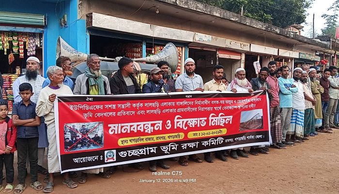 মানববন্ধনে অভিযোগ করা হয়, শনিবার (১০ জানুয়ারী) রাতের আধাঁরে রামগড় ইউনিয়নের লালছড়ি এলাকার কামাল হোসেনের ছেলে মো: জাহিদুল ইসলামের মালিকানাধীন ভূমিতে নির্মাণাধীন বসতঘর ভেঙে গুটিয়ে দেয় ইউপিডিএফ সন্ত্রাসীরা।
