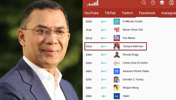 সামাজিক যোগাযোগমাধ্যম ফেসবুকে বিশ্বসেরা কনটেন্ট ক্রিয়েটরদের তালিকায় স্থান করে নিয়েছেন বিএনপির চেয়ারম্যান তারেক রহমান। সামাজিক মাধ্যম বিশ্লেষণকারী আন্তর্জাতিক ওয়েবসাইট ‘সোশ্যাল ব্ল্যাড’ প্রকাশিত শীর্ষ ১০০ ফেসবুক কনটেন্ট ক্রিয়েটরের তালিকায় তিনি ৬৩ তম অবস্থানে রয়েছেন। এই র্যাঙ্কিংয়ে মার্কিন প্রেসিডেন্ট ডোনাল্ড ট্রাম্পের চেয়ে চার ধাপ এগিয়ে তারেক রহমান।