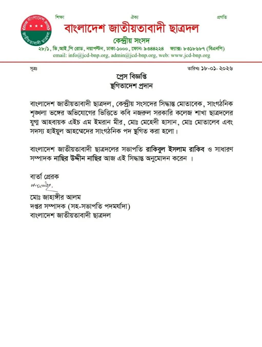 প্রেস বিজ্ঞপ্তিতে বলা হয়েছে, বাংলাদেশ জাতীয়তাবাদী ছাত্রদল, কেন্দ্রীয় সংসদের সিদ্ধান্ত মোতাবেক, সাংগঠনিক শৃঙ্খলা ভঙ্গের অভিযোগের ভিত্তিতে কবি নজরুল সরকারি কলেজ শাখা ছাত্রদলের যুগ্ম আহবায়ক এইচ এম ইমরান মীর, মো: মেহেদী হাসান, মো: মোতালেব এবং সদস্য হাইয়ুল আহম্মেদের সাংগঠনিক পদ স্থগিত করা হলো।