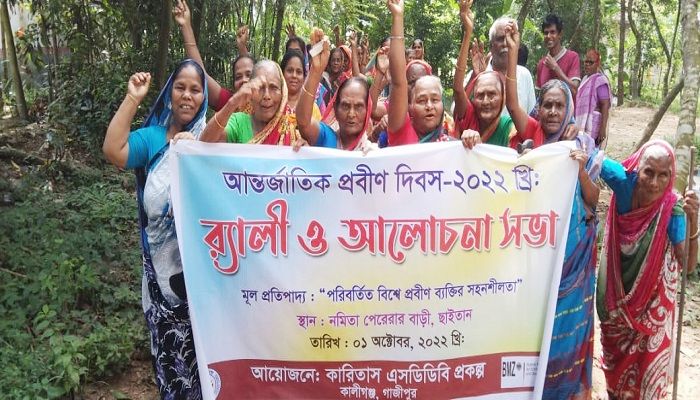দিবসটি উপলক্ষে সকালে প্রবীণ দিবস সফল হোক সফল হোক, প্রবীণদের অধিকার দিতে হবে দিয়ে দাও‘ শ্লোগানে র্যালীতে কারিতাস ঢাকা অঞ্চলের অধীনে বাস্তবায়িত এসডিডিবি প্রকল্পের প্রবীণ, প্রতিবন্ধী ও মাদকাসক্ত হিতৈষী ক্লাবের সমন্বয়ে ওই ২টি ইউনিয়নের ১৭টি ক্লাবের সদস্যরা অংশগ্রহন করেন।