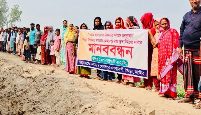 সিংড়া উপজেলার লালোর ইউনিয়নের ঢাকঢোর পাকা সড়ক থেকে মোহনপুর পর্যন্ত ১ হাজার ৫৫০ মিটার সাবমার্সিবল সড়কের কাজ বন্ধ থাকায় দুর্ভোগ পোহাতে হচ্ছে স্থানীয় বাসিন্দাদের। দুর্ভোগ থেকে মুক্তি পেতে শনিবার (২২ ফেব্রুয়ারী) বিকালে মানববন্ধন ও বিক্ষোভ করেছেন স্থানীয় বাসিন্দারা।এ সময় ঢাকঢোর-মোহনপুর সড়কের কাজ দ্রুত শেষ করার দাবি জানান তারা।
