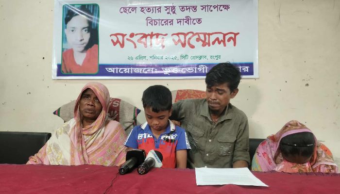 কতিপয় দুষ্কৃতিকারী ছেলেকে আঘাত করে হত্যা করে এবং হত্যাকান্ডটি ফাঁস হিসাবে চালিয়ে দিয়ে প্রকৃত ঘটনা অন্য দিকে প্রবাহিত করার চেষ্টা করার অভিযোগ এনে ছেলে হত্যার বিচার চেয়ে সংবাদ সম্মেলন করেছেন এক হতভাগী মা মোছাঃ মোর্শেদা বেগম আখি। এসময় মামলা নিতে পুলিশের গড়িমসিরও অভিযোগও করেন তিনি।
