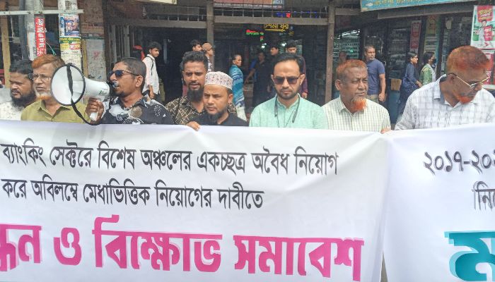 ফেনীর দাগনভূঞায় ইসলামী ব্যাংকের অবৈধ নিয়োগ বাতিলের দাবিতে বৈষম্য বিরোধী চাকরী প্রত্যাশী পরিষদ ও ইসলামী ব্যাংক গ্রাহক ফোরামের যৌথ আয়োজনে মানববন্ধন ও বিক্ষোভ মিছিল অনুষ্ঠিত হয়েছে। অবৈধ নিয়োগ বাতিল করে অবিলম্বে মেধাভিত্তিক নিয়োগের দাবীতে ও ২০১৭-২০২৪ সাল পর্যন্ত ব্যাংক লুটেরা ও মাফিয়া এস আলম কর্তৃক অবৈধভাবে নিয়োগকৃত অদক্ষ কর্মকর্তাদের অনতিবিলম্বে ছাটাইয়ের দাবীতে এই মানববন্ধনের আয়োজন করা হয়।