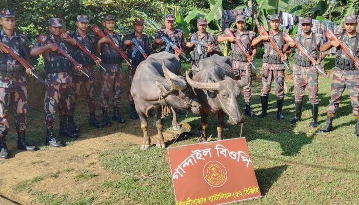 মৌলভীবাজারের বড়লেখা সীমান্ত থেকে দুটি ভারতীয় মহিষ আটক করেছে বিয়ানীবাজার ব্যাটালিয়ন (৫২ বিজিবি)। মঙ্গলবার (০৭ অক্টোবর) বিকেল আনুমানিক ৩ টার দিকে বিয়ানীবাজার ব্যাটালিয়নের অধীনস্থ গান্দাইল বিওপির একটি টহল দল সীমান্ত থেকে প্রায় ৪০০ গজ বাংলাদেশের অভ্যন্তরে বড়লেখা থানার গান্দাইল খাসিয়া পুঞ্জি এলাকা থেকে মহিষ দুটি আটক করে।
