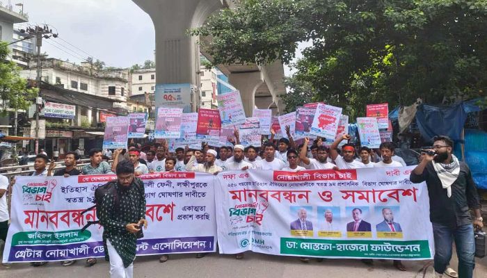 বক্তব্যে গ্রেটার নোয়াখালী ডেভেলপমেন্ট অ্যাসোসিয়েশনের সদস্য নূরনবী বলেন, বাংলাদেশের একটি অন্যতম ঐতিহ্যবাহী জেলা নোয়াখালী। কিন্তু আমরা সবসময় বঞ্চনার শিকার হয়ে এসেছি। আওয়ামী লীগ সরকারের আমলে আমাদের বিভাগ ঘোষণা করা হয়নি। তাই অন্তর্বর্তীকালীন সরকার ও প্রধান উপদেষ্টার কাছে দাবি জানাচ্ছি, আমাদের দ্রুত স্বতন্ত্র বিভাগ ঘোষণা করা হোক।