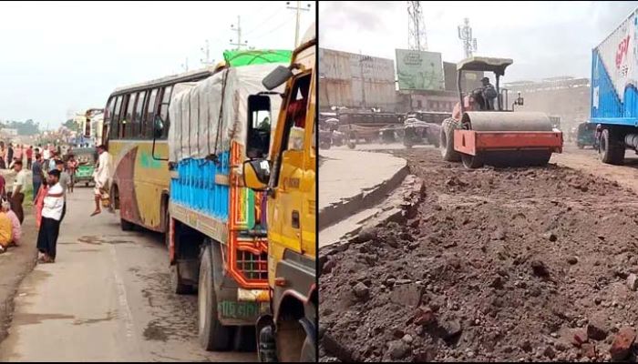যায়নি। এরমধ্যে অন্তর্বর্তী সরকার প্যাকেজ-৩ এর কাজ ঘোষণা দিয়ে বন্ধ করে দিয়েছে। চলে গেছে ভারতীয়রা, চার লেন সড়ক নির্মাণে অনিশ্চয়তা। সরেজমিনে ঢাকা-সিলেট মহাসড়কের ব্রাহ্মণবাড়িয়ার সরাইলের বেড়তলা থেকে খাটিহাতা মোড় পর্যন্ত পরিদর্শনে দেখা যায়, ছোটবড় অর্ধশতাধিক গর্ত। এসব গর্তের খানাখন্দ ভরাটের কাজ করছেন শ্রমিকরা। খাটিহাতা বিশ্বরোড মোড়ে খানাখন্দের রাস্তা মেশিন দিয়ে উপড়ে ফেলা হচ্ছে। পরে রোলার করে সমান করা হচ্ছে। এর ওপর ইট বিছানো হচ্ছে।