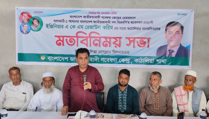 বাংলাদেশ জাতীয়তাবাদী গবেষনা কেন্দ্রের চেয়ারম্যান ইঞ্জিনিয়ার একেএম রেজাউল করিম ঝালকাঠির কাঠালিয়া প্রেসক্লাবের সাংবাদিকদের সাথে মতবিনিময় সভার আয়োজন করে। বিএনপির ভারপ্রাপ্ত চেয়ারম্যান তারেক রহমানের রাষ্ট্র সংস্কারের ৩১ দফা নিয়ে এই মতবিনিময় সভা অনুষ্ঠিত হয়েছে। আজ মঙ্গলবার সকাল ১১ টায় প্রেসক্লাব সভাকক্ষে এ মতবিনিময় সভা অনুষ্ঠিত হয়। এ সময় কাঠালিয়া প্রেসক্লাবের প্রিন্ট্র ও ইলেকট্রনিক মিডিয়ার সাংবাদিকরা উপস্থিত ছিলেন।