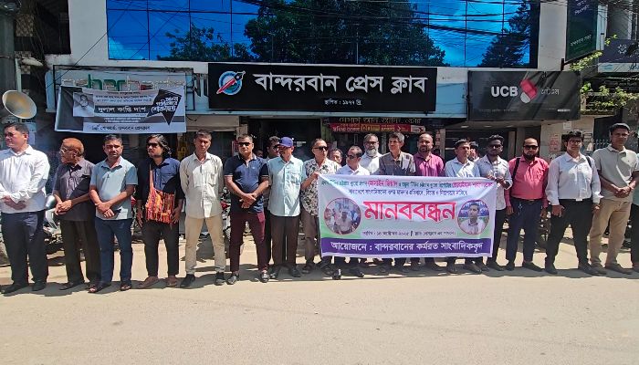 চট্টগ্রামে এখন টিভির চট্টগ্রাম ব্যুরো ও যমুনা টিভির স্টাফ রিপোর্টারসহ সারাদেশে সাংবাদিকদের উপর হামলার প্রতিবাদে মানববন্ধন করেছে বান্দরবানে কর্মরত সাংবাদিকরা। আজ মঙ্গলবার দুপুরে বান্দরবান প্রেসক্লাবের সামনে সাংবাদিকদের উপর হামলার বিচার ও নিরাপত্তা দাবিতে মানববন্ধনের এই কর্মসূচি পালন করা হয়।
