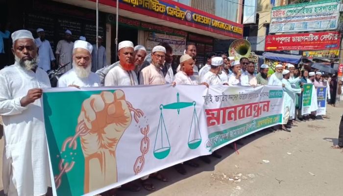 জেলা জামায়াতে ইসলামের আমির মোবারক হোসাইন আকন্দের সভাপতিত্বে আয়োজিত মানববন্ধনে বক্তব্য রাখেন সংগঠনের সাধারণ সম্পাদক আমিনুল ইসলাম, সহকারী সেক্রেটারী জুনায়েদ হাসান, প্রচার সম্পাদক মো. রোকন উদ্দিন প্রমূখ।