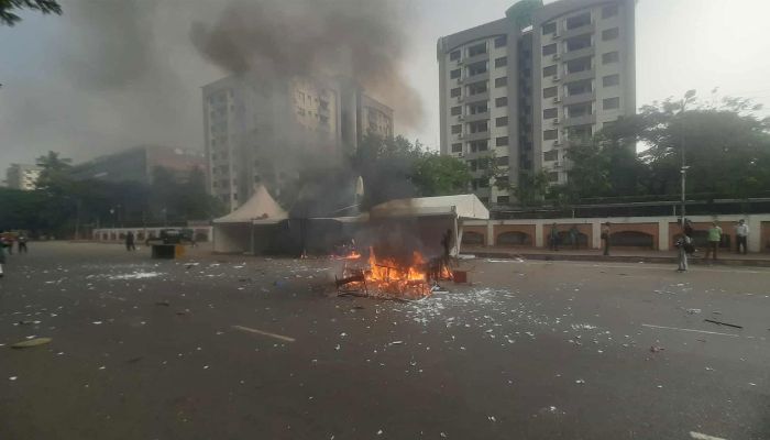 এদিকে, মানিক মিয়া এভিনিউয়ে সেচ ভবনের সামনে জুলাই সনদ স্বাক্ষর অনুষ্ঠান উপলক্ষ্যে তৈরি করা অস্থায়ী তাঁবুতেও আগুন ধরিয়ে দিয়েছেন আন্দোলনকারীরা।