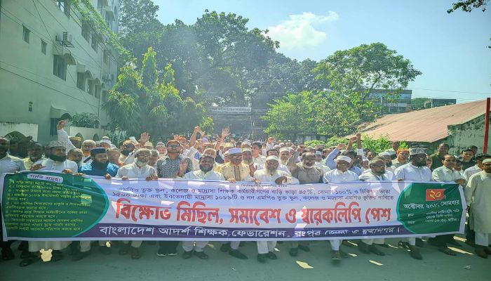 সোমবার (২০ অক্টোবর) দুপুরে বাংলাদেশ আদর্শ শিক্ষক ফেডারেশনের ব্যানারে রংপুরের বিভিন্ন উপজেলাসহ মহানগরের শিক্ষাপ্রতিষ্ঠানের শিক্ষক-কর্মচারীরা পাবলিক লাইব্রেরি মাঠ থেকে একটি বিক্ষোভ মিছিল নিয়ে নগরীর গুরুত্বপূর্ণ সড়ক প্রদক্ষিণ করে। পরে জেলা প্রশাসক কার্যালয় ঘেরাও করে তারা জেলা প্রশাসকের মাধ্যমে প্রধান উপদেষ্টা বরাবর একটি স্মারকলিপি দেন। এ সময় আদর্শ শিক্ষক ফেডারেশন মহানগরের সভাপতি গোলাম মোস্তফা, জেলা সভাপতি আব্দুল গণি, শিক্ষক ও জামায়াত নেতা রায়হান সিরাজীসহ অন্যরা উপস্থিত ছিলেন।