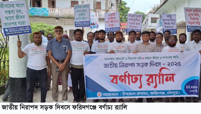 এদিকে জাতীয় নিরাপদ সড়ক দিবস ২০২৫ দিবস উপলক্ষে ফরিদগঞ্জ উপজেলা প্রশাসনের আয়োজনে র্যালি ও আলোচনা সভা অনুষ্ঠিত হয়েছে। র্যালি শেষে উপজেলা পরিষদের সভাকক্ষে উপজেলা একাডেমিক সুপার ভাইজার আব্দুল্যাহ আল মামুনের পরিচালনায় প্রধান অতিথির বক্তব্য রাখেন ভারপ্রাপ্ত উপজেলা নিবার্হী কর্মকর্তা ও সহকারি কমিশনার (ভুমি) এ আর এম জাহিদ হাসান।