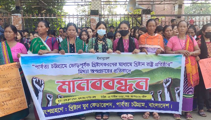 পার্বত্য চট্টগ্রামের খ্রিষ্টান সম্প্রদায় দেশপ্রেমিক এবং বাংলাদেশের সংবিধান ও সার্বভৌমত্বে অটল। বহুদিন ধরে শিক্ষা, স্বাস্থ্য, মানবিক সহায়তা ও সামাজিক উন্নয়নে অবদান রেখে আসছে। মিথ্যা প্রচারণার মাধ্যমে একটি খ্রিস্টান ধর্মের সম্প্রদায়কে কালিমালিপ্ত করার অপচেষ্টা গণতান্ত্রিক রাষ্ট্রে কখনোই কাম্য নয়। আজ শনিবার সকালে প্রেসক্লাবের সামনে “জোরপূর্বক খ্রিষ্টানকরণের মাধ্যমে খ্রিষ্টান রাষ্ট্র প্রতিষ্ঠা” শীর্ষক মিথ্যা ও উদ্দেশ্যপ্রণোদিত অপপ্রচারের প্রতিবাদ মানববন্ধনে এসব মন্তব্যে করেন বক্তারা।