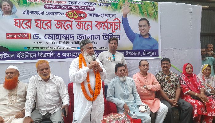 বিএনপি’র কেন্দ্রীয় নির্বাহী কমিটির সদস্য ও চাঁদপুর-২ (মতলব উত্তর- দক্ষিণ) নির্বাচনী আসনে বিএনপি’র মনোনয়ন প্রত্যাশী আলহাজ্ব ড. মোহাম্মদ জালাল উদ্দিন বলেছেন, ফেব্রুয়ারিতে জাতীয় নির্বাচন, তাই দেশ এখন নির্বাচনের পথে ধাবিত হচ্ছে। আর তারেক রহমানের ঘোষিত ৩১ দফা ধাপে ধাপে বাস্তবায়ন করা হবে। আর ৩১ দফা বাস্তবায়ন হলে দেশের প্রান্তিক জনগোষ্ঠীর অধিকার রক্ষা হবে। ৩১ দফা বাস্তবানে আমাদের মহিলা দলের নেত্রীরা মানুষের ঘরে ঘরে গিয়ে প্রিয় নেতা তারেক রহমানের সালাম পৌঁছে দিচ্ছেন।