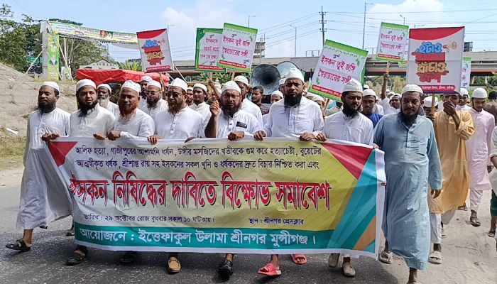 আলিফ হত্যা, গাজীপুরের আশামনি ধর্ষন, টঙ্গীবাড়ী মসজিদের খতীবকে গুম করে হত্যাচেষ্টা, বুয়েটের আত্মস্বীকৃত ধর্ষক, শ্রীশান্ত রায়সহ ইসকনের সকল খুনি ও ধর্ষকদের দ্রুত বিচার নিশ্চিত করা এবং ইসকন নিষিদ্ধের দাবিতে বিক্ষোভ সমাবেশ অনুষ্ঠিত হয়েছে। বুধবার ২৯শে অক্টোবর এত্তেফাকুল উলামা শ্রীনগর এর আয়োজনে ছনবাড়ি ব্রিজের নিচে এই সমাবেশ অনুষ্ঠিত হয়। পরবর্তীতে বিক্ষোভ মিছিল করে তা চকবাজার ও শ্রীনগর থানা হয়ে উপজেলায় গিয়ে শেষ হয়।