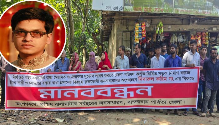 হোটেল ব্যবসায়ী দিদারুল করিমের বিরুদ্ধে দীর্ঘ ৪৫ বছর চলাচলের রাস্তায় বাধা প্রদানের অভিযোগ উঠেছে। এ ঘটনায় বান্দরবানে মানববন্ধন করেছে ভুক্তভোগী শতাধিক পরিবার। আজ বুধবার সকালে পশ্চিম বালাঘাটায় স্বর্ণমন্দির সংলগ্ন রাস্তায় এই মানববন্ধন কর্মসূচি পালন করা হয়। এসময় চলাচলের বাধা প্রদানকারী দিদারুল করিম বিরুদ্ধে মানববন্ধন কর্মসূচিতে অংশ নেন সেখানকার শতাধিক বাসিন্দারা।