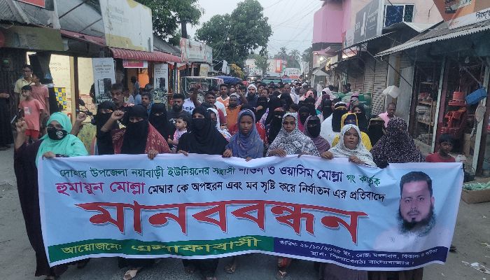 ঢাকার দোহার উপজেলায় অপহরণ ও মব সৃষ্টি করে ইউপি সদস্য হুমায়ুন কবিরকে নির্যাতনের পর পুলিশের হাতে তুলে দেওয়ার অভিযোগে মানববন্ধন করেছে এলাকাবাসী। গতকাল মঙ্গলবার সন্ধ্যায় উপজেলার বাংলাবাজারে পাচঁশতাধিক নারী পুরুষ লাইনে দাড়িয়ে এ মানববন্ধন করে।