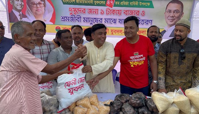 বাংলাদেশ জাতীয়তাবাদী যুবদলের ৪৭তম প্রতিষ্ঠাবার্ষিকী উপলক্ষে ফেনীতে তিন শতাধিক হতদরিদ্রের জন্য এক টাকায় নিত্য বাজার ও শ্রমজীবী পাঁচ শতাধিক অসহায় মানুষের মাঝে খাবার বিতরণ করা হয়েছে। বুধবার (২৯ অক্টোবর) শহরের পুরাতন মুক্ত বাজারস্থ জুলাই চত্বরে ফেনী জেলা যুবদলের আয়োজনে এ কর্মসূচি অনুষ্ঠিত হয়।