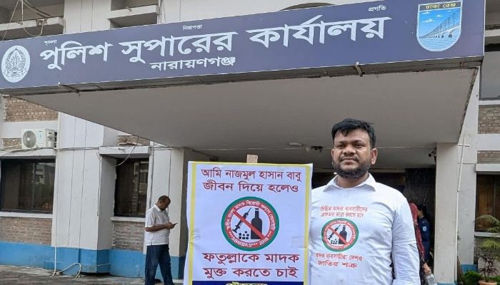নারায়ণগঞ্জ ফতুল্লাকে মাদকমুক্ত করার দৃঢ় প্রত্যয় নিয়ে মাঠে নেমেছেন তরুণ সমাজকর্মী নাজমুল হাসান বাবু। গত বৃহস্পতিবার সকালে তিনি নারায়ণগঞ্জ পুলিশ সুপারের কার্যালয়ের সামনে দাঁড়িয়ে হাতে প্ল্যাকার্ড নিয়ে ঘোষণা দেন- “আমি নাজমুল হাসান বাবু, জীবন দিয়ে হলেও ফতুল্লাকে মাদকমুক্ত করব।”