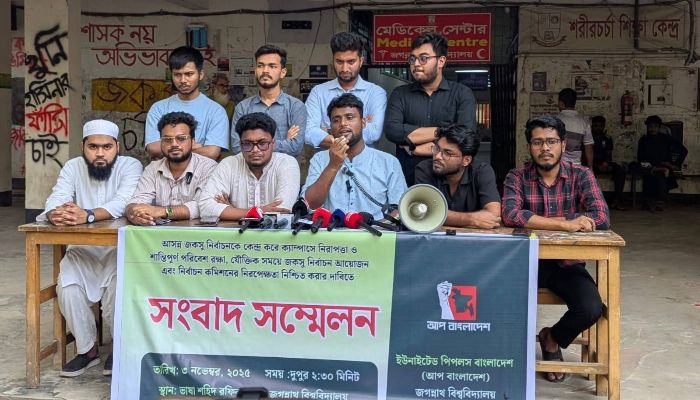 সংবাদ সম্মেলনে আপ বাংলাদেশের কেন্দ্রীয় সদস্য ও জবির প্রধান সংগঠক মাসুদ রানা বলেন, ‘আমরা যখন জকসুর দাবিতে অনশন করছিলাম, তখন বিশ্ববিদ্যালয় প্রশাসন কোনো প্রকার যদি-কিন্তু ছাড়া ২৭ নভেম্বরের মধ্যে নির্বাচন অনুষ্ঠিত করার প্রতিশ্রুতি দিয়ে আমাদের অনশন ভাঙিয়েছিল। কিন্তু আমরা দেখছি, একটি মহল এখন নির্বাচন পেছানোর পাঁয়তারা করছে। ডিসেম্বরে ২১তম ব্যাচের ভর্তি পরীক্ষা, বিভিন্ন বিভাগের সেমিস্টার ফাইনাল পরীক্ষা অনুষ্ঠিত হবে। তাই ২৭ নভেম্বরই নির্বাচন আয়োজনের মোক্ষম সময়।’