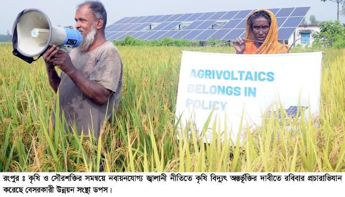 কৃষি ও সৌরশক্তির সমন্বয়ে নবায়নযোগ্য জ্বালানি নীতিতে কৃষি বিদ্যুৎ অন্তর্ভূক্তির দাবিতে রংপুরে প্রচারাভিযান হয়েছে। বেসরকারি উন্নয়ন সংস্থা ডপসের আয়োজনে রোববার (৯ নভেম্বর) বিকেলে নগরীর তাজহাট মহাসড়কে এতে ডপসের নির্বাহী পরিচালক উজ্জ্বল চক্রবর্তীর সভাপতিত্বে বক্তব্য রাখেন, নারী নেত্রী লিপিকা ইয়াসমিন, সমাজকর্মী মো. সুমন, যুব নেতা ইতি আক্তার, ডপসের সমন্বয়কারী সুবল মুখার্জিসহ অন্যরা।