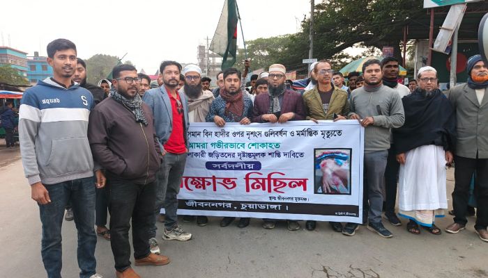 ইনকিলাব মঞ্চের মুখপাত্র, জুলাই আন্দোলনের অন্যতম যোদ্ধা ও ঢাকা-৮ আসনের সম্ভাব্য স্বতন্ত্র সংসদ সদস্যপদ প্রার্থী ওসমান হাদির হত্যার বিচারের দাবিতে চুয়াডাঙ্গার জীবননগরে বিক্ষোভ সমাবেশ ও দোয়া অনুষ্ঠিত হয়েছে। আজ শনিবার আসরের নামাজের পর জীবননগর বাসস্ট্যান্ডে সর্বদলীয় ব্যানারে এই বিক্ষোভ সমাবেশ ও দোয়া অনুষ্ঠিত হয়।