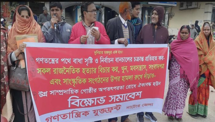 গণতান্ত্রিক যুক্তফ্রন্ট নাটোর জেলা শাখার উদ্যোগে একটি বিক্ষোভ সমাবেশ অনুষ্ঠিত হয়েছে। বুধবার দুপুর সাড়ে ১২টার দিকে নাটোর শহরের কানাইখালি এলাকায় এই সমাবেশ অনুষ্ঠিত হয়। গণতান্ত্রিক যুক্তফ্রন্ট নাটোর জেলা শাখার উদ্যোগে বিক্ষোভ সমাবেশ