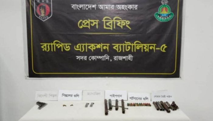 রাজশাহীর তানোরে গভীর রাতে বিশেষ অভিযান চালিয়ে বিদেশি পিস্তল ও বিপুল পরিমাণ দেশীয় অস্ত্রসহ গোলাবারুদ উদ্ধার করেছে র্যাপিড এ্যাকশন ব্যাটেলিয়ান র্যাব-৫। জানা গেছে, গোপন সংবাদের ভিত্তিতে রোববার (২৭ ডিসেম্বর) রাত সাড়ে ১২টা থেকে দেড়টা পর্যন্ত উপজেলার মুন্ডুমালা পৌরসভার
