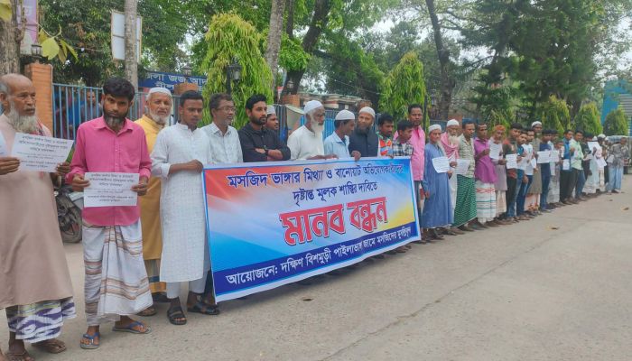 সোমবার (৩০ মার্চ) দুপুরে জেলা প্রশাসকের কার্যালয়ের সামনে আয়োজিত এ মানববন্ধনে শতাধিক মুসল্লি ও স্থানীয় গণ্যমান্য ব্যক্তিরা অংশ নেন।