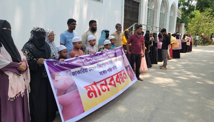 নবাবগঞ্জে মাদরাসার চার শিক্ষার্থীকে নির্যাতন: শিক্ষকদের শাস্তির দাবিতে বিক্ষোভ ও মানববন্ধন