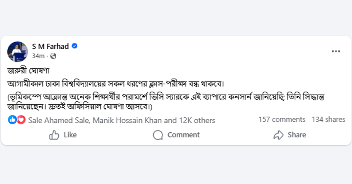 এস এম ফরহাদ তার পোস্টে বলেন, ‘আগামীকাল ঢাকা বিশ্ববিদ্যালয়ের সকল ধরনের ক্লাস-পরীক্ষা বন্ধ থাকবে।’