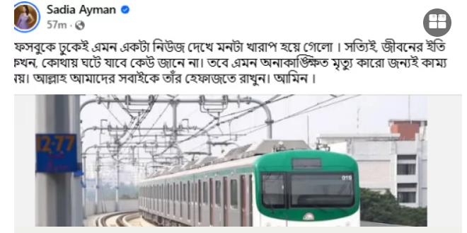 সংবাদটি শোনার পর সোশ্যাল মিডিয়ায় তার মনের গভীর কষ্ট প্রকাশ করেছেন অভিনেত্রী। সংবাদের একটি ফটোকার্ড শেয়ার করে তিনি লিখেছেন, ‘ফেসবুকে ঢুকেই এমন একটা নিউজ দেখে মনটা খারাপ হয়ে গেলো। সত্যিই, জীবনের ইতি কখন, কোথায় ঘটে যাবে কেউ জানে না। তবে এমন অনাকাঙ্ক্ষিত মৃত্যু কারো জন্যই কাম্য নয়। আল্লাহ আমাদের সবাইকে তার হেফাজতে রাখুন। আমিন।’