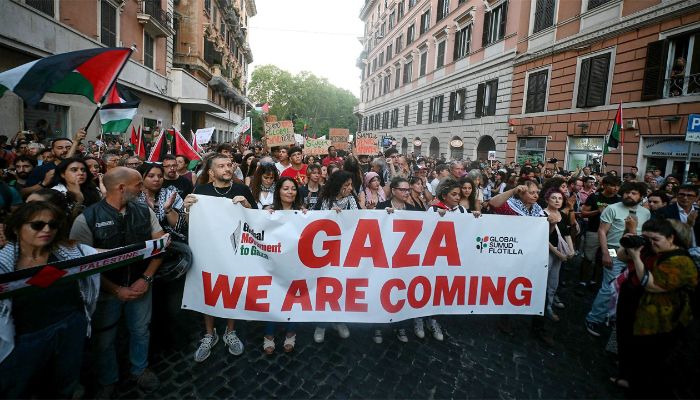 আন্তর্জাতিক সংবাদমাধ্যমে এ খবর প্রকাশিত হওয়ার কিছুক্ষণের মধ্যে ইতালির রাজধানী রোমের তেরমিনি স্টেশনের কাছে পিয়েজ্জা দেই কিনিকুয়েসেন্তো চত্বরে জড়ো হয়ে শত শত ফিলিস্তিনপন্থি আন্দোলনকারী নৌযানগুলো এবং ক্রু-যাত্রীদের ছেড়ে দেওয়ার দাবি জানান। এ সময় তারা তেরমিনি স্টেশনের সংলগ্ন ও আশপাশের সব সড়কে যান চলাচল বন্ধ করে দেন এবং স্লোগান দিতে থাকেন ‘ফ্লোটিলা এবং ফিলিস্তিনের জন্য সবকিছু বন্ধ থাকবে।’