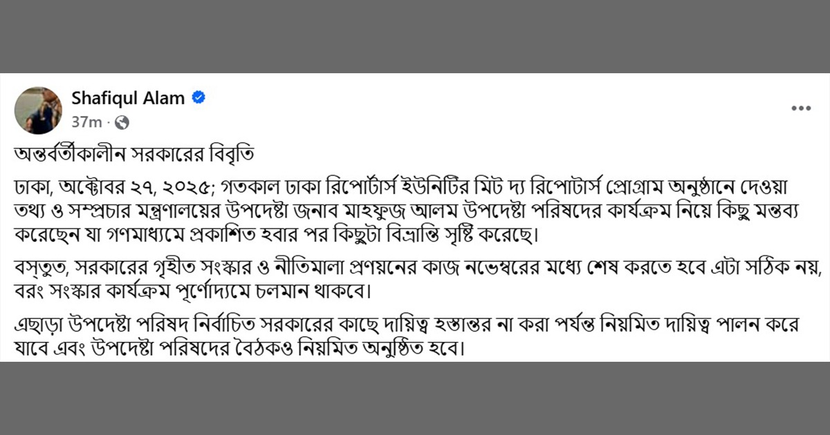 প্রধান উপদেষ্টার প্রেসসচিব শফিকুল আলম বিবৃতিটি নিজের ভেরিফায়েড ফেসবুক পেজে শেয়ার করেছেন।