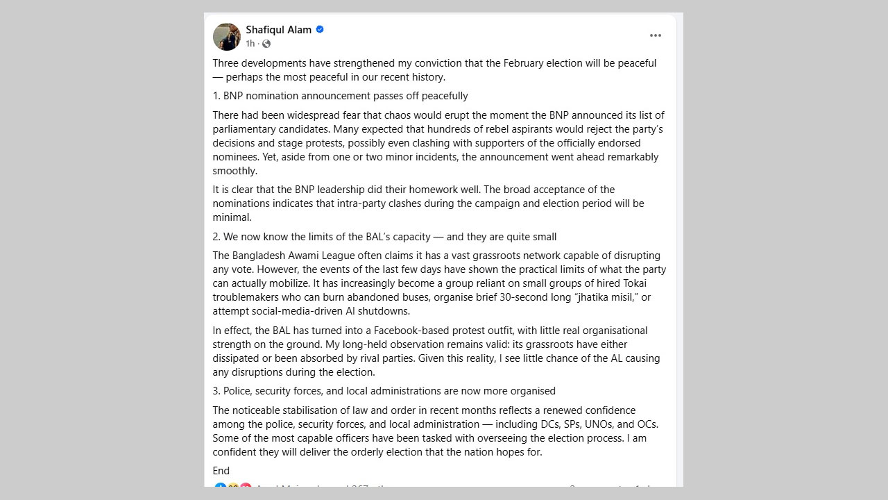 পোস্টে তিনি লেখেন, তিনটি সাম্প্রতিক ঘটনা আমার বিশ্বাসকে আরও শক্তিশালী করেছে যে, ফেব্রুয়ারির নির্বাচন শান্তিপূর্ণ হবে। বরং আমাদের সাম্প্রতিক ইতিহাসে সবচেয়ে শান্তিপূর্ণ নির্বাচন হওয়ার সম্ভাবনাও রয়েছে।