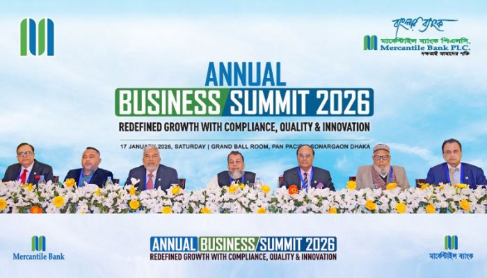 মার্কেন্টাইল ব্যাংকের ‘বার্ষিক ব্যবসায়িক সম্মেলন-২০২৬’ শনিবার (১৭ জানুয়ারি) রাজধানীর প্যান প্যাসিফিক সোনারগাঁও হোটেলে অনুষ্ঠিত হয়। সম্মেলনে প্রধান অতিথি ছিলেন ব্যাংকের পরিচালনা পর্ষদের চেয়ারম্যান মোঃ আনোয়ারুল হক এবং সভাপতিত্ব করেন ব্যাংকের ব্যবস্থাপনা পরিচালক মতিউল হাসান।